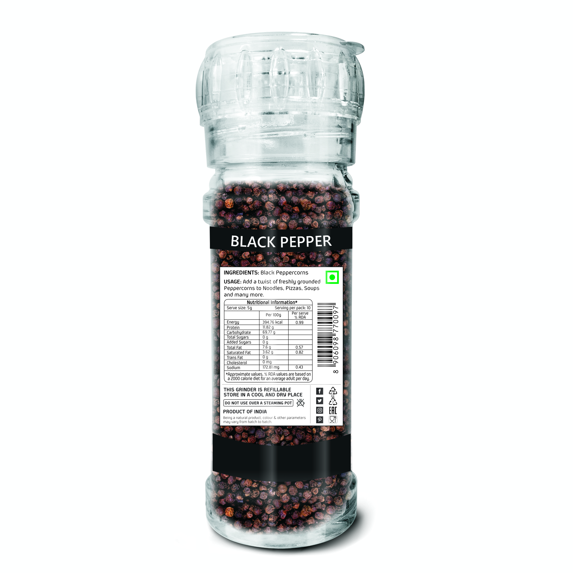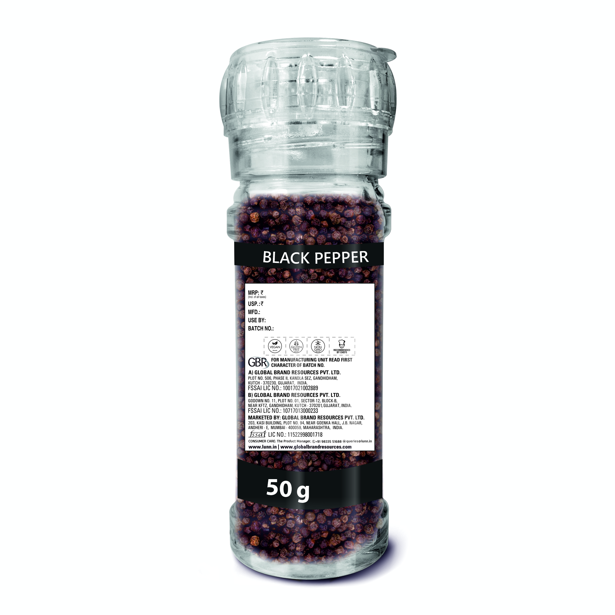BLACK PEPPERCORN IN GLASS JAR WITH GRINDER CAP- 50 gm.